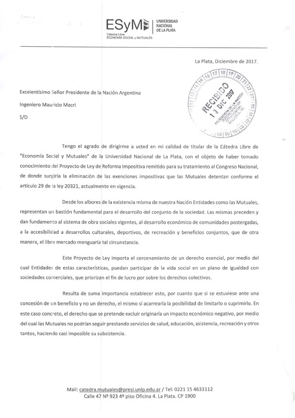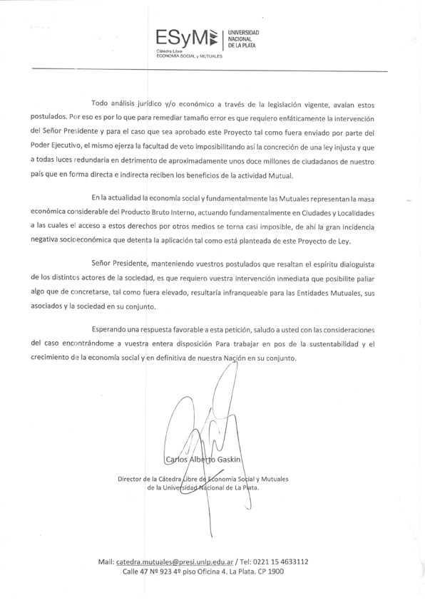 La Cátedra Libre de Economía Social de la Universidad Nacional de La Plata, a cargo del Dr. Carlos Gaskin, Presidente la Asociación Mutual de Empleados Bonaerenses AMEBO y de la Federación de Mutuales Regional La Plata FMRLP, le envió una carta al Presidente de la Nación Argentina, Ing. Mauricio Macri, al respecto de la problemática del proyecto de Ley tendiente a la eliminación de las exenciones impositivas de mutuales y cooperativas.